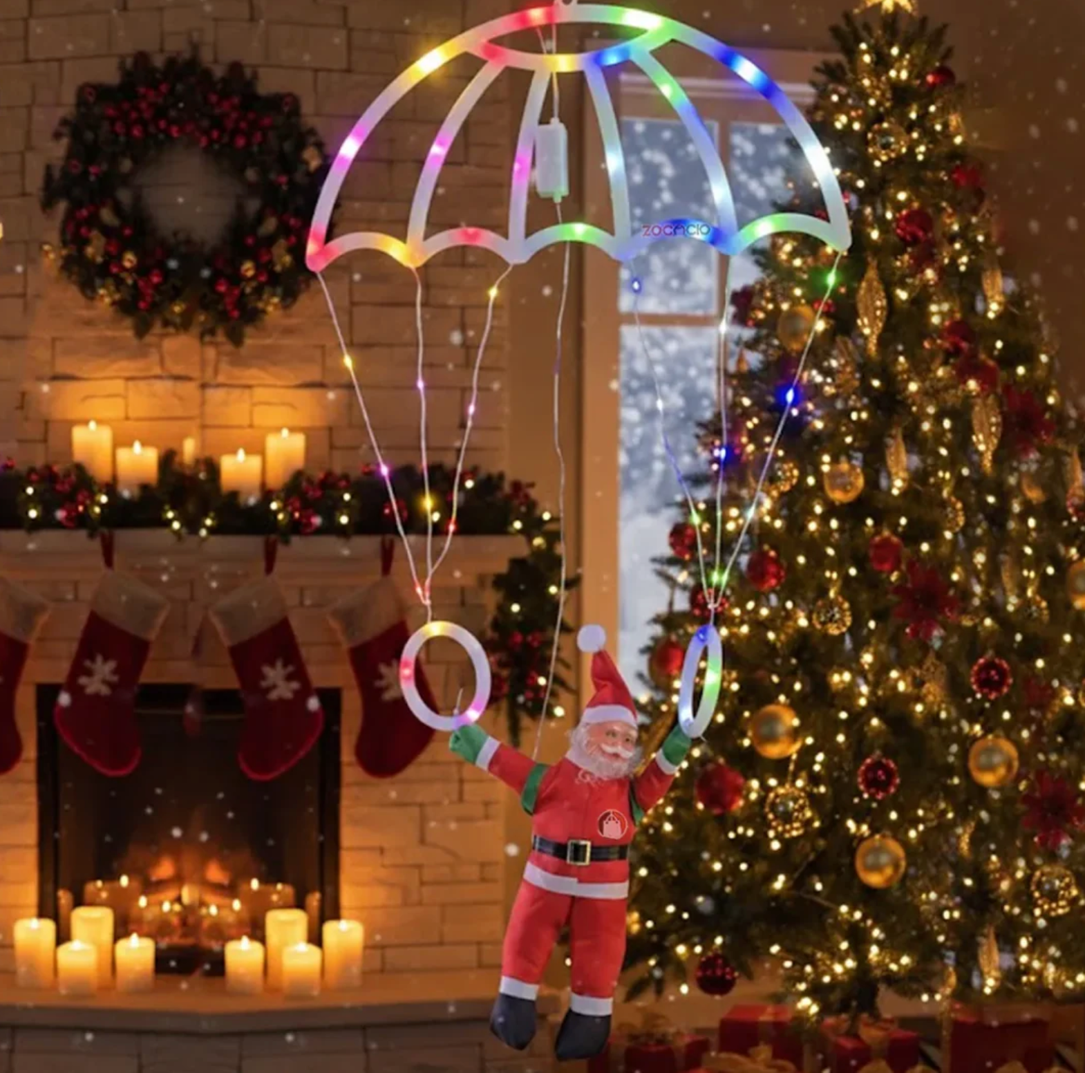 Imagina mirar hacia arriba y ver a Papá Noel descendiendo con su paracaídas iluminado, listo para traer alegría, color y magia a tu hogar.