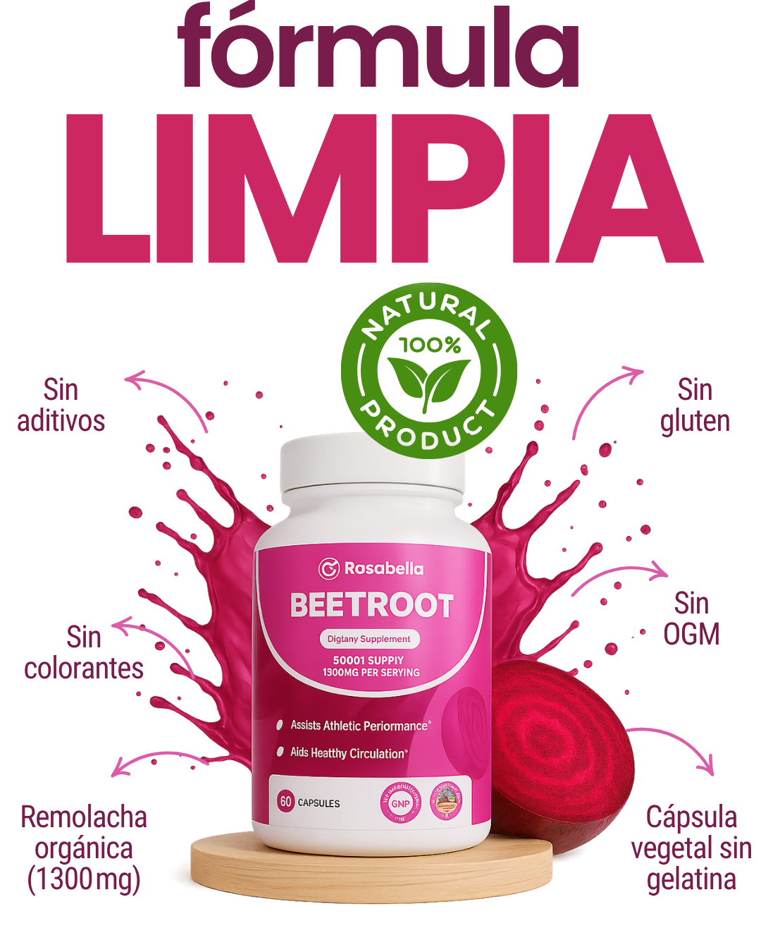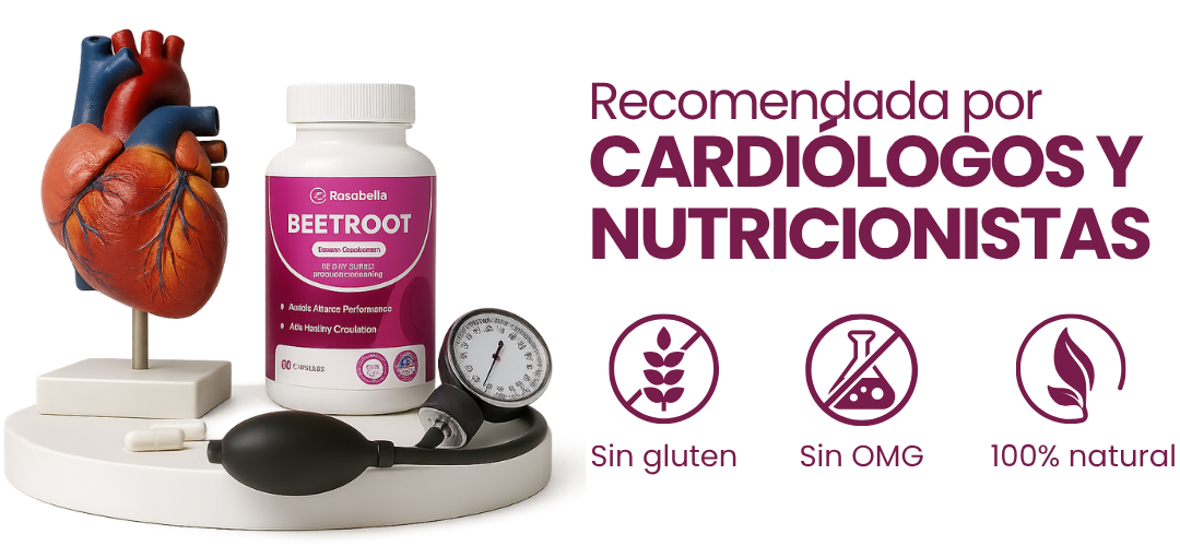 Cada cápsula de Rosabella ofrece 1300 mg de remolacha orgánica, que el cuerpo convierte en óxido nítrico, una molécula vasodilatadora clave para mejorar el flujo sanguíneo, oxigenar tejidos, aumentar la energía y apoyar la producción de glóbulos rojos, cuidando la salud del corazón.