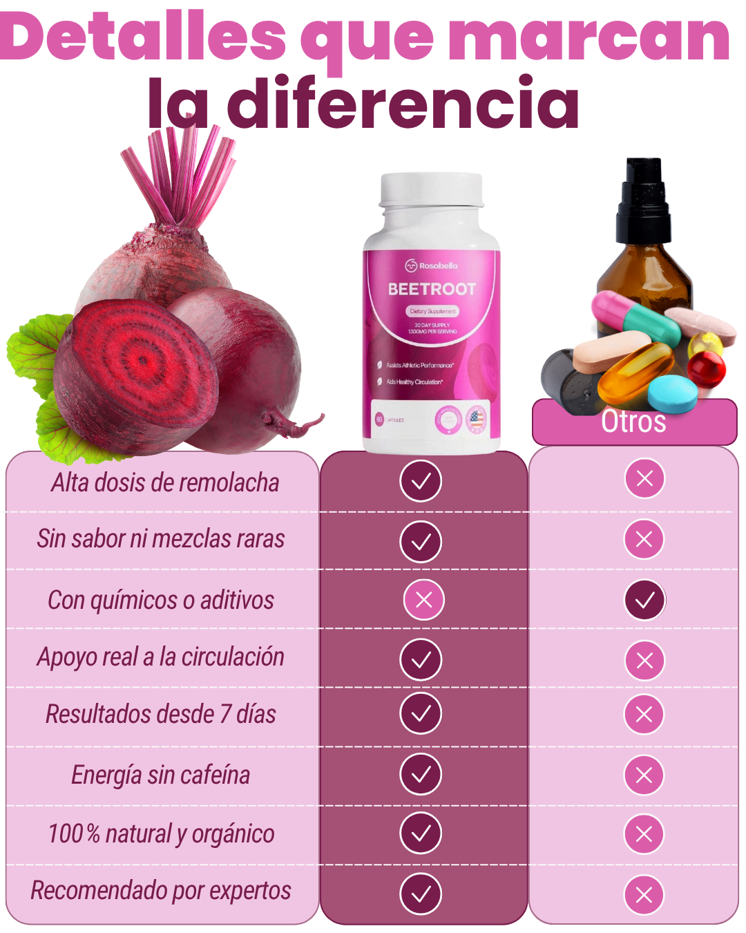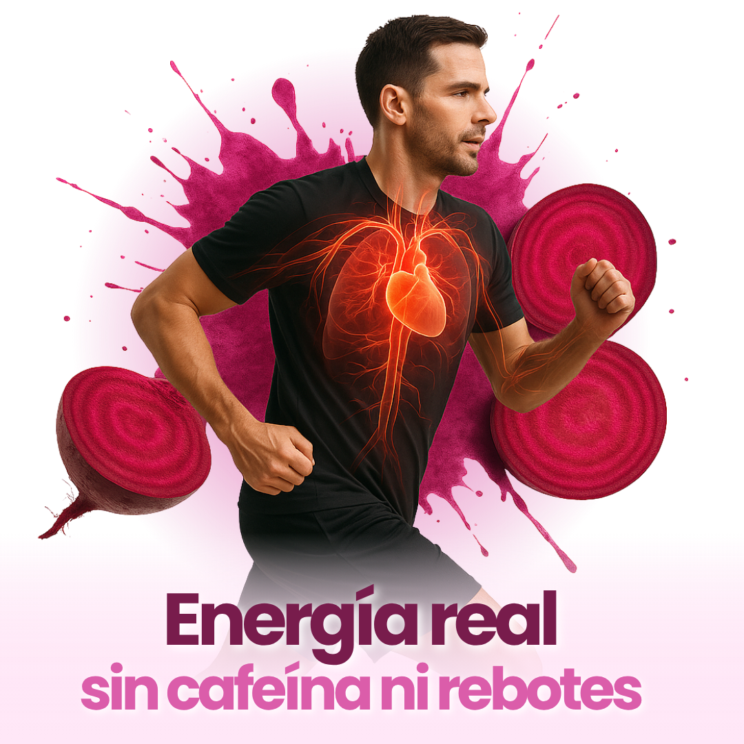 Con una dosis alta de nitratos naturales, Rosabella aumenta tu energía de forma sostenida, sin cafeína, sin bajones, y te ayuda a sentirte fuerte desde la primera semana.