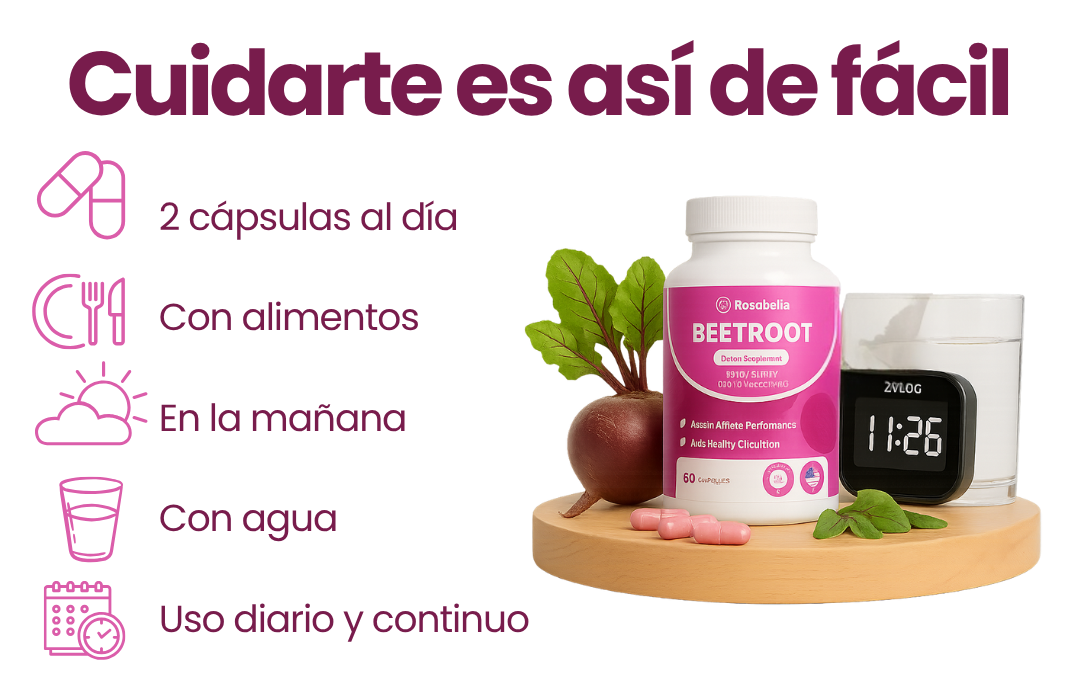 Rosabella es una fórmula clínica a base de remolacha orgánica, sin químicos, que apoya tu recuperación desde adentro, mejora tu resistencia diaria y fortalece las funciones que mantienen tu cuerpo activo, vital y protegido.